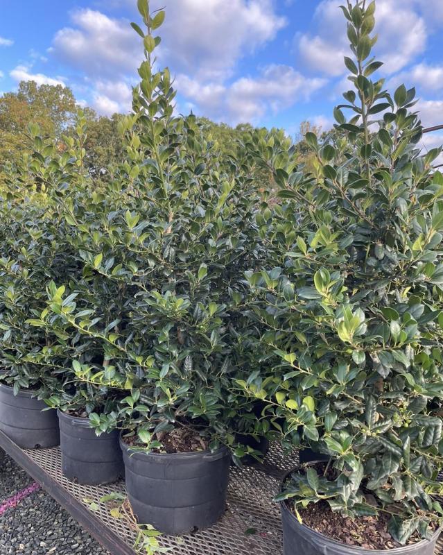 These Hollies are vigorous growers and can reach up to 25 feet if left unchecked. They thrive in full sun but can handle partial shade. for more info on pests and diseases (rare, but possible), check the NC State Extension Gardener Toolbox on Nellie R. Stevens or ask us on your visit.
