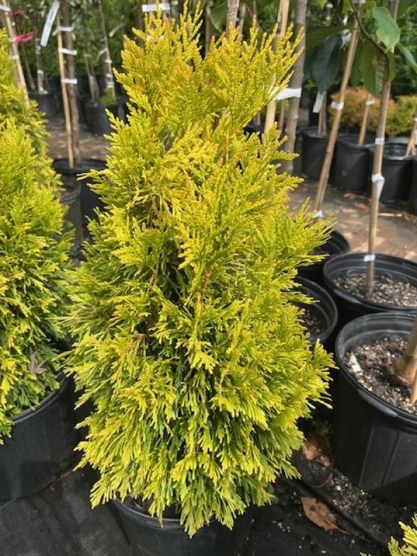 If you’ve struggled with plants dying on you during a hot Piedmont Triad summer, you need to switch to this plant. ‘Forever Goldy’ is a Thuja plicata (Western Red Cedar).
