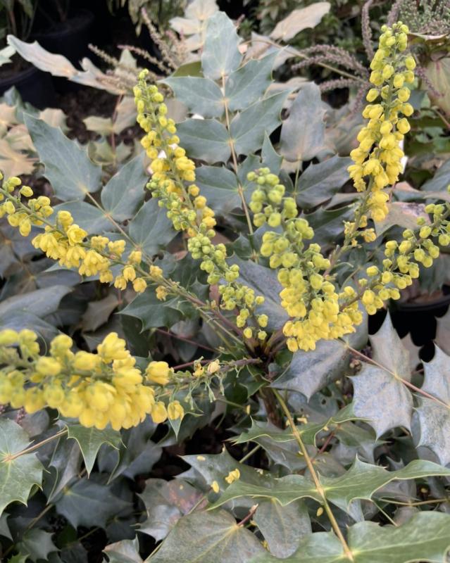 The Leatherleaf Mahonia is a steady grower, typically reaching 6–10 feet tall and wide. It loves the shade and tolerates our local clay soil well once established. For more on how to care for this winter warrior, check out the NC State Extension Plant Toolbox [Berberis bealei] or chat with our team at the nursery.